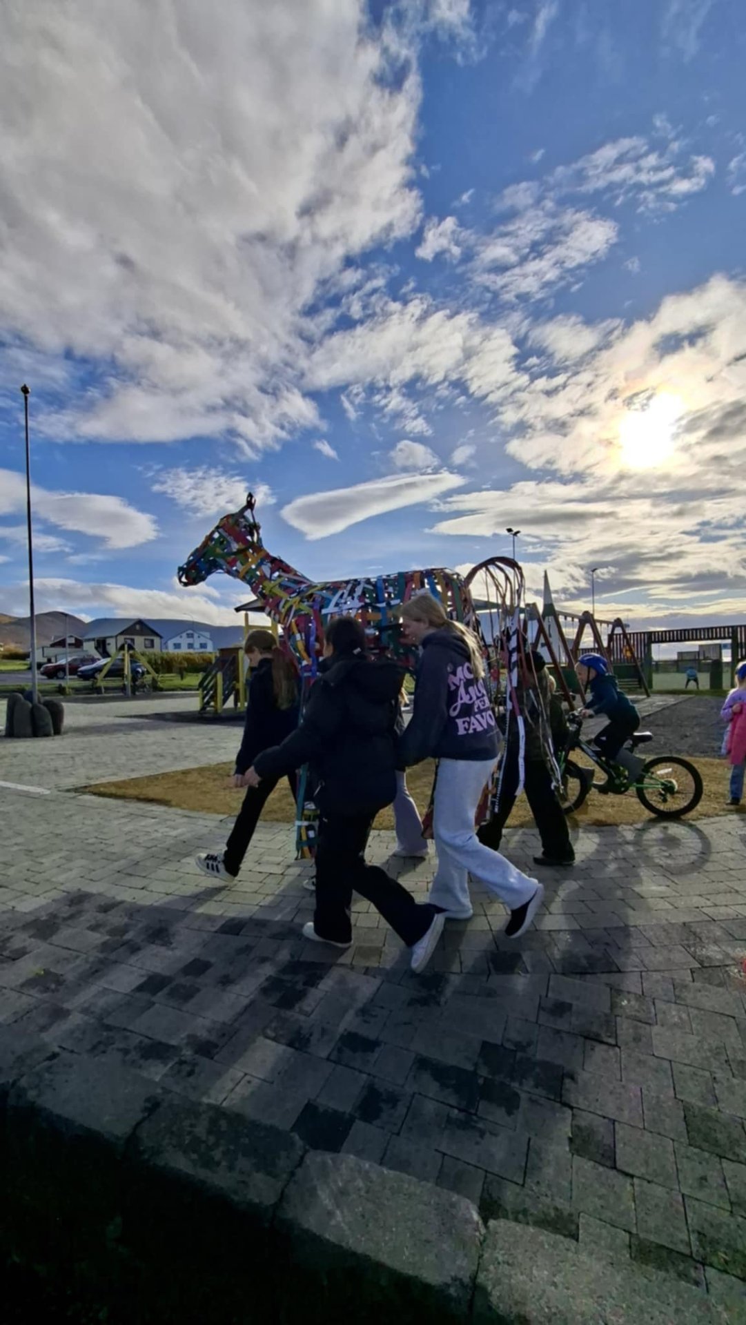 Þetta dýr sköpuðum við í sameiningu við listamenn úr Nes listamiðstöð. Við byrjuðum á því að taka pappakassa í sundur og máluðum báðar hliðar, önnur hliðin var litrík og hin svört og hvít með mynstri. Pappinn var skorinn í strimla og við mótuðum úr þeim dýr sem átti að líkjast hesti. Við ákváðum að gera mjög stóran hest og var hann síðan festur saman með heftum.